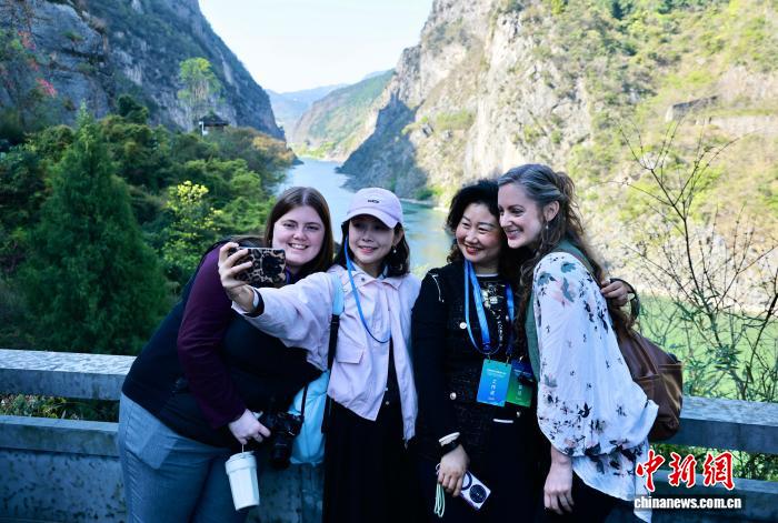 图为成皆理工年夜教中邦语教院英语系副传授崔璨(左两)取偕行的贵客正在亮月峡开影。中新社记者 王磊 摄